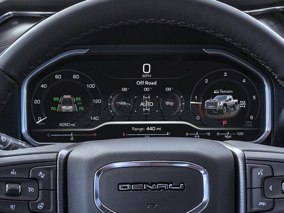 Sierra Heavy Duty features an available 12.3" diagonal digital Driver Information Center. Control and customize important vehicle, driving and infotainment content with high-resolution clarity.