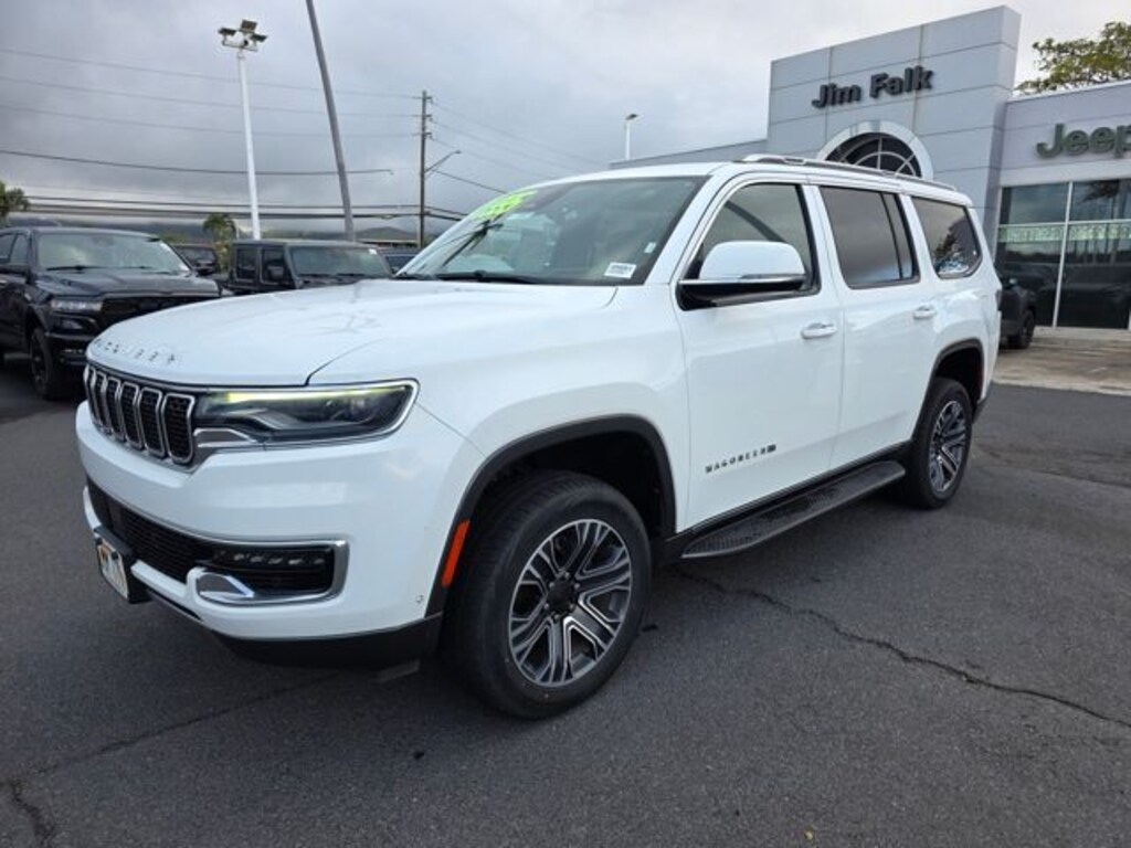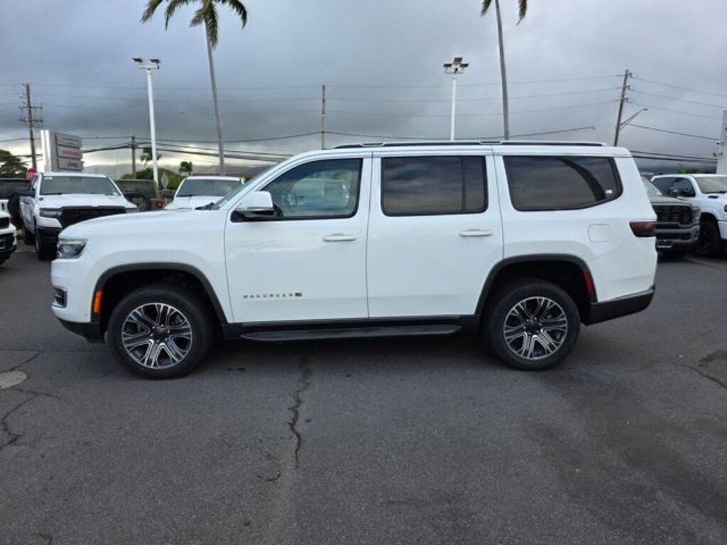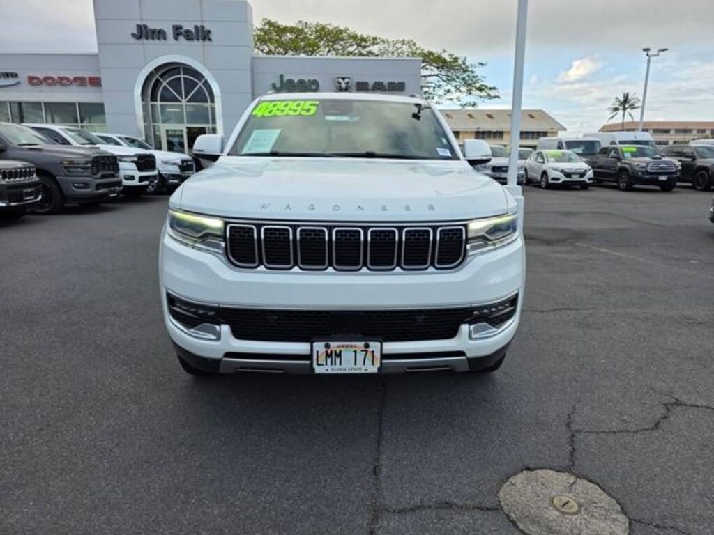 This Jeep Wagoneer has many features and is well equipped including 10 Speakers, 3.21 Rear Axle Ratio, 3rd row seats: bench, 4-Wheel Disc Brakes, ABS brakes, Adjustable pedals, Air Conditioning, Alloy wheels, AM/FM radio: SiriusXM with 360L, Anti-whiplash front head restraints, Audio memory, Auto High-beam Headlights, Auto-dimming door mirrors, Auto-dimming Rear-View mirror, Auto-leveling suspension, Automatic temperature control, Brake assist, Bumpers: body-color, Compass, Delay-off headlights, Driver door bin, Driver vanity mirror, Driver's Seat Mounted Armrest, Dual front impact airbags, Dual front side impact airbags, Electronic Stability Control, Exterior Parking Camera Rear, Four wheel independent suspension, Front anti-roll bar, Front Bucket Seats, Front Center Armrest w/Storage, Front dual zone A/C, Front fog lights, Front reading lights, Fully automatic headlights, Garage door transmitter, Genuine wood console insert, Genuine wood dashboard insert, Genuine wood door panel insert, Heads-Up Display, Heated door mirrors, Heated front seats, Heated rear seats, Heated steering wheel, Illuminated entry, Knee airbag, Leather Trimmed Bucket Seats, Low tire pressure warning, Memory seat, Navigation System, Normal Duty Suspension, Occupant sensing airbag, Outside temperature display, Overhead airbag, Overhead console, Panic alarm, Passenger door bin, Passenger seat mounted armrest, Passenger vanity mirror, Pedal memory, Power adjustable front head restraints, Power door mirrors, Power driver seat, Power Liftgate, Power passenger seat, Power steering, Power windows, Radio data system, Radio: Uconnect 5 Nav w/10.1" Display, Rain sensing wipers, Rear air conditioning, Rear anti-roll bar, Rear dual zone A/C, Rear reading lights, Rear seat center armrest, Rear window defroster, Rear window wiper, Reclining 3rd row seat, Remote keyless entry, Security system, Speed control, Speed-sensing steering, Speed-Sensitive Wipers, Split folding rear seat, Steering wheel memory, Steering wheel mounted audio controls, Tachometer, Telescoping steering wheel, Tilt steering wheel, Traction control, Trip computer, Turn signal indicator mirrors, Variably intermittent wipers, Ventilated front seats, Voltmeter, and Wheels: 20" x 9.0" Premium 2 Aluminum. Bright White Clearcoat 2022 Jeep Wagoneer Series III 4WD 8-Speed Automatic 5.7L V8