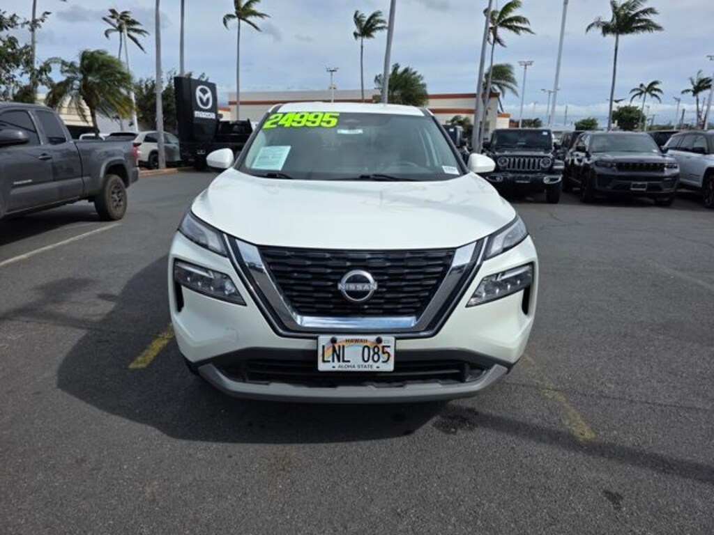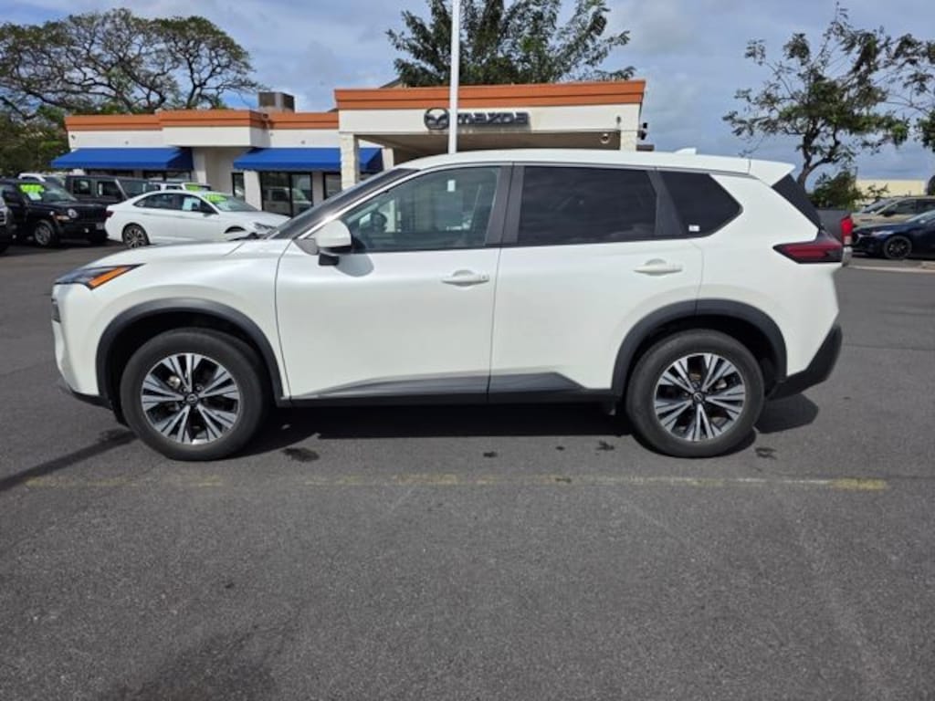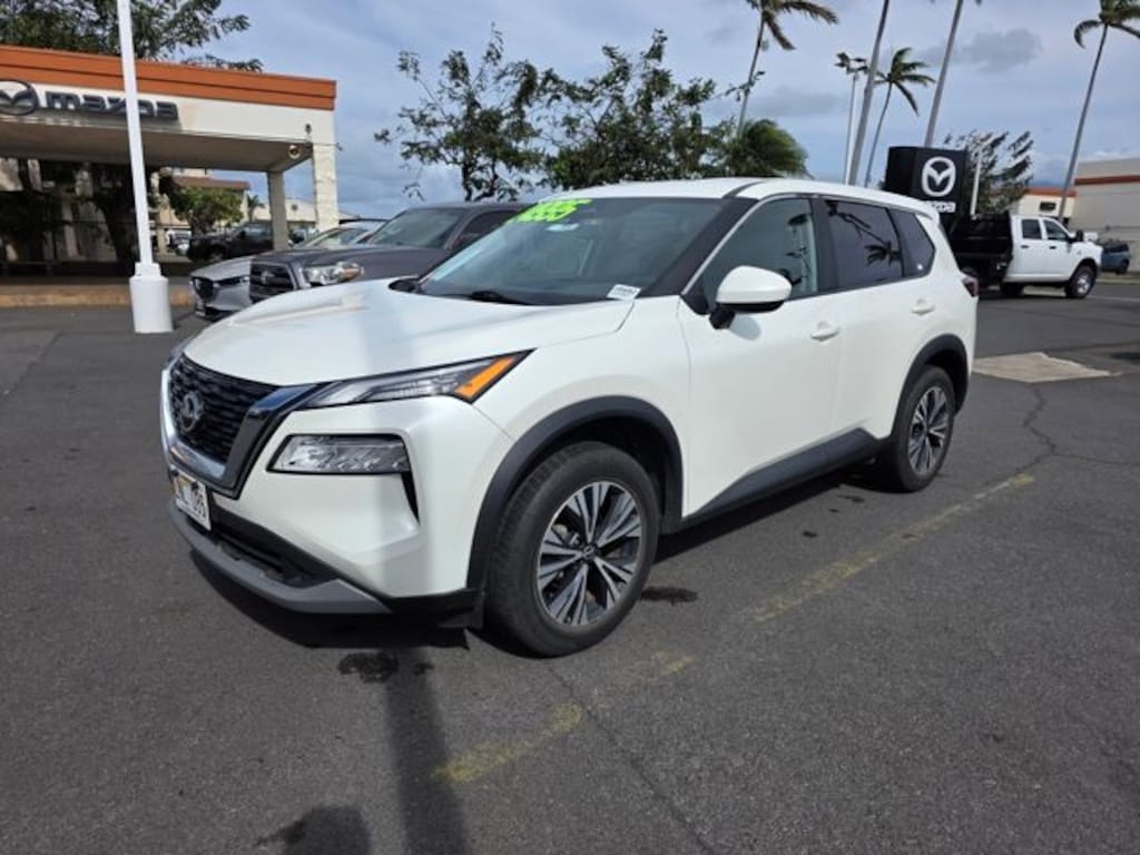 This Nissan Rogue has many features and is well equipped including 18" Aluminum Alloy Wheels, 4-Wheel Disc Brakes, 5.604 Axle Ratio, 6 Speakers, ABS brakes, Air Conditioning, Alloy wheels, AM/FM Radio, AM/FM radio: SiriusXM, Auto High-beam Headlights, Automatic temperature control, Brake assist, Bumpers: body-color, Cloth Seat Trim, Delay-off headlights, Driver door bin, Driver vanity mirror, Dual front impact airbags, Dual front side impact airbags, Electronic Stability Control, Emergency communication system: NissanConnect Services, Floor Mats w/1-Piece Cargo Area Protector, Four wheel independent suspension, Front anti-roll bar, Front Bucket Seats, Front Center Armrest, Front dual zone A/C, Front reading lights, Fully automatic headlights, Heated door mirrors, Illuminated entry, Knee airbag, Low tire pressure warning, NissanConnect featuring Apple CarPlay and Android Auto, Occupant sensing airbag, Outside temperature display, Overhead airbag, Overhead console, Panic alarm, Passenger door bin, Passenger vanity mirror, Power door mirrors, Power driver seat, Power steering, Power windows, Radio data system, Rear anti-roll bar, Rear Parking Sensors, Rear seat center armrest, Rear side impact airbag, Rear window defroster, Rear window wiper, Remote keyless entry, Speed control, Speed-Sensitive Wipers, Split folding rear seat, Spoiler, Steering wheel mounted audio controls, Tachometer, Telescoping steering wheel, Tilt steering wheel, Traction control, Trip computer, and Variably intermittent wipers. Pearl White Tricoat 2023 Nissan Rogue SV FWD CVT with Xtronic 1.5L I3 Turbocharged DOHC 12V LEV3-ULEV50 201hp